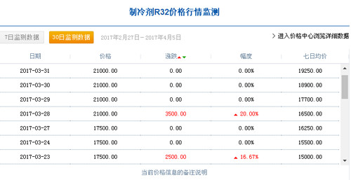 3月1日,中國R32制冷劑廠家出廠價格集中在14000元/噸,3月31日達到21000元/噸,三月份同比上漲50%;一個月內(nèi)R32制冷劑漲價達到5成。據(jù)制冷大市場記者了解,2月7日,中國R32制冷劑廠家出廠價格集中在12750元/噸。